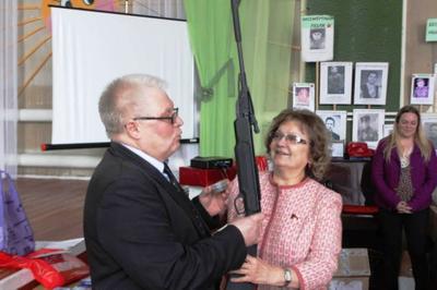 Не осталась без подарков и школа. Ольга Алимова привезла с собой и передала школе копию Знамени Победы, которое стало символом победы советского народа над фашизмом. Кроме того, при участии депутата-коммуниста для школьного стрелкового клуба была приобретена пневматическая винтовка.