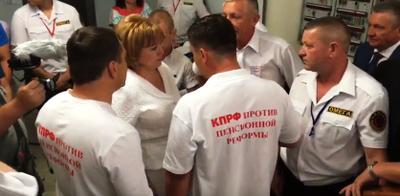Первый секретарь Саратовского обкома КПРФ, зампред облдумы О.Н. Алимова пришла на заседание регионального парламента в рубашке с медальоном «Пенсия в 55 лет...и ни минутой больше!», а остальные депутаты фракции КПРФ: Н.Н. Бондаренко, В.Е. Есипов, А.В. Нараевский и их помощники пришли в майках с надписями «КПРФ против пенсионной реформы!».