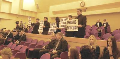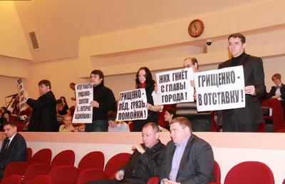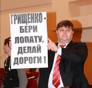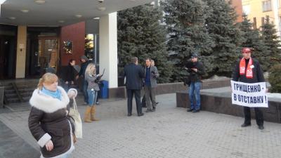 Вначале, перед заседанием, первый секретарь горкома КПРФ Александр Анидалов вышел на одиночный пикет у здания думы с плакатом: «Грищенко – в отставку!»