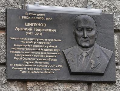 В Туле на доме, где долгие годы жил выдающийся конструктор-оружейник, руководитель Конструкторского бюро приборостроения, Герой Социалистического Труда Аркадий Шипунов, открыта мемориальная доска в память о нем.