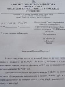 Немного предыстории. В феврале 2017-го Николай Моисеевич обратился в Воронежскую приемную Сергея Гаврилова, депутата Государственной Думы от КПРФ, Председателя Комитета Государственной Думы по развитию гражданского общества, вопросам общественных и религиозных организаций. К депутату руководителя организации «Дети военного времени» привела необходимость разобраться с арендной платой за помещение, выделенное городской властью детям войны.