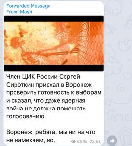 "Член ЦИК России Сергей Сироткин приехал в Воронеж проверить готовность к выборам и сказал, что даже ядерная война не должна помешать голосованию.