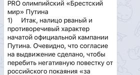1) Итак, налицо рваный и противоречивый характер начатой официальной кампании Путина. Очевидно, что согласие на выдвижение сделано, чтобы перебить негативную повестку от российского покаяния «за пробирки» и скандального, унизительного решения МОК. Следующим объектом атаки может стать чемпионат мира по футболу. Интересно, как этот чемпионат российские власти будут проводить, если сборной России предложат и здесь выступать под белым флагом? Вообще, белый флаг над «Putinteam» на Олимпиаде в Корее – это впечатляющий символ, предъявление которого российскому электорату добились окружающие Путина либералы.
