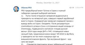 PRO предвыборный визит Путина в Сирию и нужный либералам сценарий выборной кампании1). Путин после оглашения намерения выдвинуться в президенты на четвертый срок, совершил первый зарубежный визит в Сирию. Очередной раз прозвучал очередной приказ к выводу войск из Сирии. Ожидаемо. После дискредитации олимпийского успеха в Сочи и отстранения нашей команды от Олимпиады, подвешенного состояния «плодов русской весны» 2014 года в виде ДНР и ЛНР, готовящихся новых санкций США, продолжения возни вокруг ЧМ-2018 по футболу у президента не так много козырных карт на внешнеполитическом фронте. Про внутренний фронт – все сами все видят.