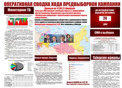 1. Кампания Путина продолжает оставаться удивительно вялой и «кабинетной». Почти неделю он проводит по встрече в день, и преимущественно это немассовые встречи. Некоторые источники выдвигают версию ухудшения здоровья. Аудиторию убеждают в активности президента через очередные аресты по коррупционным обвинениям.
