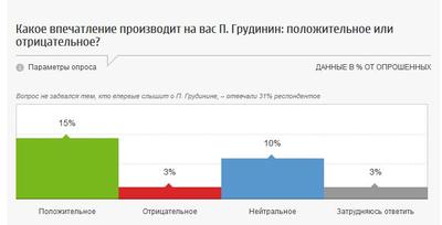 5. Но вот другие цифры из опроса ФОМ. Из 31 процента знающих о Грудинине позитивные мнения о нем высказали 15 процентов, а отрицательные – 3 процента. Опять простая экстраполяция: если знать о Грудинине будут не 31, а 70 процентов, то при сохранении нынешней пропорции позитив-негатив положительно его должны оценивать 34 процента избирателей. И при такой методике прогнозирования получаем у Грудинина треть сторонников.