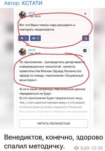 10. Хорошей иллюстрацией того, что вокруг эпидемии идет жестокая информационная война со сменой «темников» служит конфуз главного редактора «Эхо Москвы» Венедиктова, который случайно «спалил» темник, который спустили из мэрии для «отмывания» в общественном мнении электронной системы слежения за жителями в режиме самоизоляции (см. иллюстрацию). В любом случае, еще раз подчеркнем вывод: «тест на глобальное управление через эпидемию страха в целом проходит успешно».