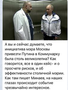 - Заражение короновирусом главного врача больницы «Коммунарке» Д. Проценко стало одним из главных информационных событий вчерашнего дня, и может иметь серьезные последствия. Дело в том, что, как известно, по инициативе мэра Москвы С. Собянина и, как пишут «инсайдеры», вопреки позиции ФСО, президент вместе с Голиковой, министрами и самим московским градоначальником Собяниным посетил «Коммунарку», где общался с Проценко без средств защиты и на близкой дистанции. Все это произошло 24 марта, а 31 марта у главврача диагностирована была «Модная болезнь». Объективно в повестку опять встал вопрос обеспечения безопасности первого лица в стране и не только угрозы здоровье главы государства (что уж тогда говорить про заботу власти о здоровье простых граждан, когда в аптеках нет до сих пор ни масок, ни санитайзеров).Пока небезызвестный Песков рассказывает, что у Путина и всех побывавших в Коммунарке берут тест на коронавирус ежедневно, и ничего плохого не произошло. Но анонсированное совещание Путина с членами правительства неожиданно перевели в дистанционный формат.