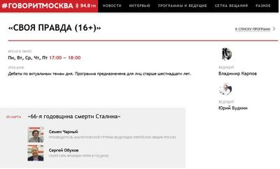 В эфире радиостанция «Говорит Москва» член Президиума, секретарь ЦК КПРФ Сергей Обухов в ходе дискуссии в программе «Своя правда» о роли в истории нашей страны И.В. Сталина дискутировал с оппонентом - журналистом, политологом, руководителем аналитической группы Федерации еврейских общин России (ФЕОР) Семеном Чарным.