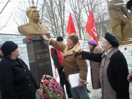 129 день рождения И.В.Сталина в Северной Осетии. Сегодня вся Осетия, как и вся страна, отметила день рождения Иосифа Виссарионовича Сталина. С самого утра жители республики направлялись к памятникам И.В.Сталину. Более тысячи человек пришли поклониться памяти великого человека. Живые цветы, корзины цветов, венки – свидетельство почитания памяти Верховного Главнокомандующего СССР. Северная Осетия всегда была республикой, где уважали все то, что в свое время делали и Ленин, и Сталин. В Осетии к Сталину всегда было особое отношение. Жизнь и государственная деятельность Сталина оставила глубочайший след не только в судьбах миллионов отдельно взятых людей, но и в исторической памяти сотен народов, населявших Россию. Политик, добившийся единственного за всю историю нового времени подлинного и беспримерного экономического чуда, превратив огромную полуразрушенную аграрную страну, опустошенную и обескровленную, в индустриального и военного гиганта. Один из выдающихся руководителей Советского Союза, Генералиссимус, он пользовался в народе и армии огромным авторитетом, основанным, прежде всего, на достигнутых под его руководством неоспоримых успехах в Великой Отечественной войне. Наши фронтовики в бой шли со словами "За Родину! За Сталина!"Народная любовь к нему была огромна. Авторитет имени Сталина жизнен и сегодня. Память Верховного Главнокомандующего СССР, Генералиссимуса Иосифа Виссарионовича Сталина увековечена в памяти народа, ему воздвигнуты памятники в разных городах и селах нашей страны - свидетельство нашего уважения к нему. Почтить память вождя собрались сегодня и коммунисты республики во главе с секретарем ЦК КПРФ, первым секретарем Северо-Осетинского рескома КПРФ, депутатом Парламента РСО-Алания Казбеком Тайсаевым . Памятник Иосифу Сталину есть в каждом ущелье Северной Осетии. Первый памятник Сталину был воздвигнут в поселке Верхний Фиагдон в Куртатинском ущелье в 1950-е годы. Бюст "вождя народов" на пятиметровом постаменте установили по инициативе и на средства коммунистов Дигорского района Северной Осетии. Памятники и бюсты установлены – в парке культуры и отдыха г.Алагира, на базе отдыха заповедника «Бекан», у здания районной администрации Кировского района, во дворе школы №2 г.Ардона, у здания администрации сел.Комгарон, в центре г.Беслана на ул.Сигова, в парке Победы г.Моздока и т.д. Если общество сегодня не хочет, чтобы улицу Сталина переименовали, это ли не доказательство признания его заслуг? В селениях Ногир, Чермен, Чикола, Хумалаг, Коста, Нарт, станицах Змейская, Калининская, городах Ардон, Дигора, Беслан, Алагир именем Сталина названы центральные улицы. Сегодня нет практически ни одного населенного пункта в Северной Осетии, где бы не было улицы имени Сталина. Мероприятия, посвященные 129 дню рождения И.В.Сталина, прошли по всей республике. А 10-летний юбилей своего райкома отметил в торжественной обстановке один из городских райкомов КПРФ г.Владикавказа – Сталинский. На торжественное мероприятия пришли коммунисты района, представители рескома КПРФ, работники научной библиотеки, в актовом зале которой отмечали праздник. Сегодня пополнились и ряды райкома партии – 15 молодых ребят встали рядом со своими старшими товарищами, чтобы завтра продолжить их дело. «Быть верным делу Ленина и Сталина», - таков был н