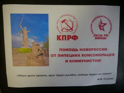 В помощь народу ДНР и ЛНР были собраны продукты питания, тёплая военная форма, медикаменты, зимняя одежда, обувь и даже парафиновые свечи. Всего около трёхсот килограммов продовольствия и столько же тюков с вещами. На все коробки наклеены листы со словами И.В. Сталина: «Наше дело правое, враг будет разбит, победа будет за нами!» и с логотипами липецких областных отделений КПРФ и ЛКСМ.