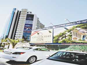 среднем обходится хозяевам квартир в десять тысяч рублей. Всего в главном 18-этажном здании расположено 180 квартир – от 55 до 160 кв. метров. Высота потолков более трех метров. Террасы площадью до 15 кв. м, с прозрачным парапетом, выходят на море и на Курортный проспект. Скоростные лифты отделаны зеркалами, и когда поднимаешься на лифтах, открывается панорама на море, отражающаяся на зеркальных стенах. Здесь же можно приобрести коттедж площадью от 750 до 1000 квадратных метров с просторными многоуровневыми террасами, расположенными в парковой зоне. Огромный холл отделан мрамором, на стенах дорогие панно. В холлах на каждом этаже стоит кожаная мебель для отдыха, висят люстры, как в Кремлевском дворце, есть консьерж, на красивом столе в холле