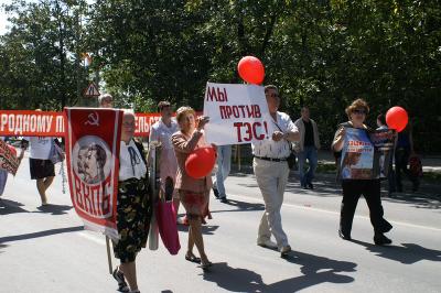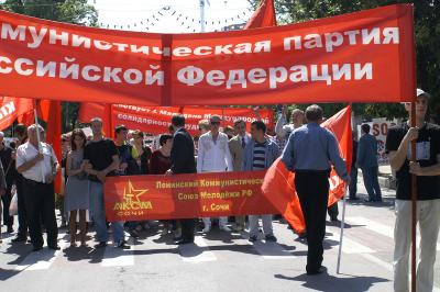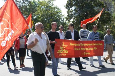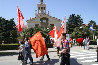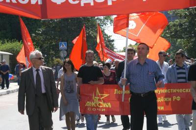 Дело в том, что одновременно с митингом и концертом, организованными компартий, своё шествие по тому же маршруту проводила администрация города. И, как всегда, административный ресурс был осенён флагами Единой России. Но была и одна новинка, объяснившая причину задержки полицией движения колонны под знамёнами КПРФ. Дело в том, что в построенной на пути следования демонстрантов трибуне-помосте восседал сам градоначальник, он же главный сочинский единоросс А. Пахомов. Его нежный, исходящий безупречной честностью и добротой взор, направленный к «правильным» демонстрантам, никак нельзя было омрачать видом «неправильной» колонны, шедшей под знамёнами, транспарантами и лозунгами КПРФ, а также с лозунгом против строительства Кудепстинской ТЭС. Так что за те 5-7 минут, пока полиция и сотрудник администрации искусственно удерживали движение колонны КПРФ, наш досточтимый мэр, как говорится, «успел вовремя смыться», распустив заодно и находящихся там же операторов электронных СМИ. Тем самым, поставлен первый предолимпийский рекорд на пути к проведению ЗОИ-2014. То ли ещё будет!