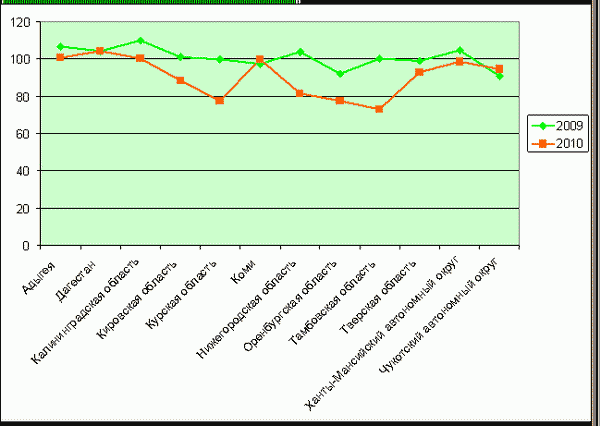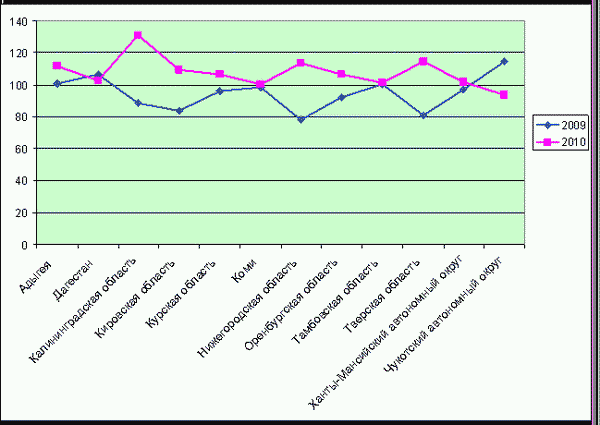 В целом по России в 2010 году наблюдался рост промышленного производства (рис.1). Так, индекс производства вырос по сравнению с 2009 годом на 8%. Все выборные регионы, кроме Чукотского автономного округа, также показывали рост промышленного производства. Несмотря на это, большинство регионов все же не достигли докризисного уровня развития и наиболее проблемными, по-прежнему, остаются регионы с машиностроительной и текстильной специализацией: Тверская, Нижегородская и Кировская области. Лидерами роста остаются регионы с высокой инвестиционной привлекательностью (Калининградская, Оренбургская области) и регионы с более развитым агропромышленным комплексом, позволяющим сгладить негативные кризисные явления.