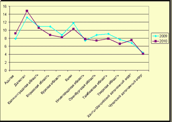 Средний уровень безработицы в России в 2010 г. составил 7,5%, что выше уровня докризисного показателя 2008 года (6,3%). В ряде выборных регионов он значительно выше общероссийского (рис.3). Как и в докризисные годы, наиболее проблемными в плане занятости населения остаются слаборазвитые регионы, в частности, республики Адыгея и Дагестан, и депрессивные регионы (Тверская область и Кировская области). В целом же в 2009-2010 г.г. набольшие показатели безработицы показывали регионы со значительным спадом промышленного производства, главным образом, специализирующиеся на машиностроении и черной металлургии – Нижегородская и Оренбургская области. Меньшие же темпы сокращения уровня безработицы по сравнению с темпами роста промышленного производства говорят о некоторой инертности рынка труда.
