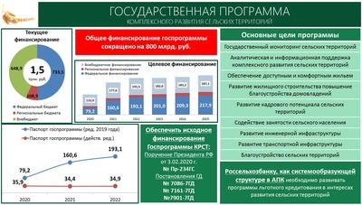 И вот в прошлом году мы в качестве результата нашей с вами напряженной совместной работы по отстаиванию интересов сельских жителей получили государственную программу «Комплексное развитие сельских территорий», которая оказалась на порядок взвешеннее и с объемами финансирования, в целом соответствующими поставленным целям – 2,3 тралю рублей, из которых на федеральный бюджет приходился 1 трлн. рублей.