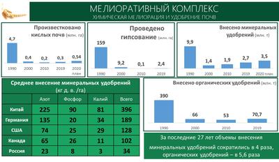 Минеральные удобрения, органика вносятся в почву в объемах в 3-6 раз меньше научно обоснованных объемов, раскисление и гипсование почв не проводится вовсе.