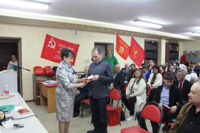 Конференция началась с приятных моментов, троим новобранцам Компартии: Д.П. Панкратову (Волжский РК КПРФ), Д.А. Земцову и А.А. Голубковой (Заводской РК КПРФ) первый секретарь Саратовского обкома КПРФ, депутат Госдумы РФ VI созыва О.Н. Алимова вручила партийные билеты.