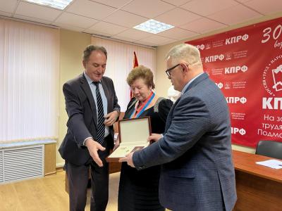 Затем первый секретарь МК КПРФ, депутат Госдумы Николай Васильев и секретарь МК КПРФ, заместитель Председателя Мособлдумы – руководитель фракции КПРФ Александр Наумов поздравили от лица всех коммунистов МК КПРФ секретаря Подольского ГК КПРФ, депутата Мособлдумы от КПРФ Татьяну Никитас с прошедшим юбилеем. И заместитель Председателя Мособлдумы – руководитель фракции КПРФ Александр Наумов и депутат Госдумы Николай Васильев вручили депутату Мособлдумы Татьяне Никитас знак Московской областной Думы «За вклад в развитие законодательства» I степени.