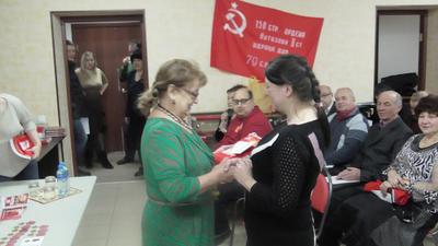 Перед началом мероприятия О.Н. Алимова выполнила приятную обязанность, вручив партийные билеты новобранцам Компартии, а также поздравив с юбилеями и днями рождений товарищей по партии.