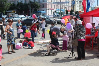 Кроме рисования желающие принимали участие в музыкальном конкурсе. Дети исполняли под аккордеон с музыкальным руководителем Т.Иванченко песни "Пусть всегда будет солнце!", "Вместе весело шагать", "Если с другом вышел в путь"... Малыши читали стихи о маме, о солнце. Все выступления юных исполнителей встречали громкими аплодисментами. А под песню меленьких утят взрослые и дети взялись за руки и стали дружно танцевать. Юные калужане под дружные аплодисменты запустили в небо символ мира — белых голубей...