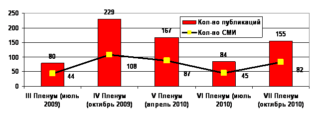 Как видно из графика, по показателям освещения в СМИ октябрьский Пленум на 7,5% не дотягивает до V (апрельского) Пленума 2010 г. (167 сообщений в 87 СМИ), где обсуждались проблемы социалистической модернизации. И более чем в два раза уступает прошлогоднему IV (октябрьскому) Пленуму (229 сообщений в 108 СМИ), на котором обсуждался вопрос защиты прав трудящихся и усиление политического влияния КПРФ.