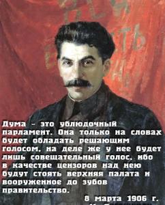 Нет, не любят вспоминать они о таком Сталине. Не нравятся им ни Сталин-созидатель, ни Сталин-революционер. Говорят они только о том, как Сталин ломал планы тогдашних глобалистов и заговоры мировой закулисы с её отечественной обслугой – якобы прообразом сегодняшней оппозиции. А ВЫДУМАННЫЙ ИМИ образ Сталина прикрывает их ложь, маскирует глупость их слов и обманывает тех, на кого эти манипуляторы хотят влиять.