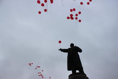 В завершении митинга в небо было выпущено 100 алых воздушных шаров, как символичный салют в честь 100-летия Великого Октября.