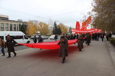 Далее, под звуки бессмертного Интернационала в исполнении духового оркестра, сотни человек построились в колонны под красными стягами, и шествие двинулось по центральным улицам города, скандируя: "Да здравствует Великая Октябрьская социалистическая революция". Участники клуба "Живая история" несли впереди многометровое алое полотно флага Советского Союза.