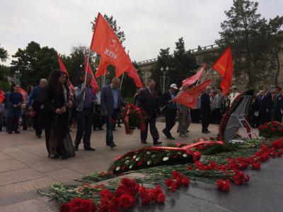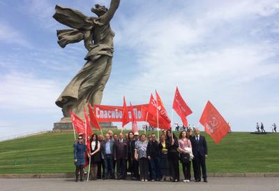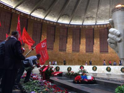 Почтив память воинов у вечного огня на площади Павших Борцов, однопартийцы под красными флагами Победы поднялись к подножию Мамаева Кургана. Там собравшиеся возложили цветы в пантеоне Славы. Стоит отметить, что колонна под Советскими знаменами прошла по всем памятным местам мемориального комплекса, и везде представители КПРФ воспринимались прохожими как еще один символ Великой Победы. Многие жители и гости города спешили сфотографироваться на фоне алеющих флагов.