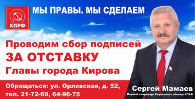 Напомним, несколькими днями раньше были испорчены баннеры КПРФ, призывающие к сбору подписей за отставку действующего мэра г. Кирова Владимира Быкова - призыв к сбору подписей заклеили липкой лентой, предварительно разбив камеру видеонаблюдения, расположенную поблизости.