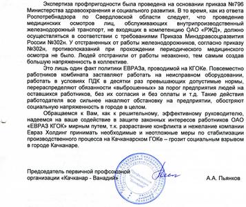 Очень надеюсь, что администрация губернатора примет самые оперативные меры для предотвращения социальной катастрофы на градообразующем комбинате г. Качканар. Если нет – КПРФ вместе с профсоюзом КГОКа будет добиваться реакции властей куда более радикальными методами, чем письма.