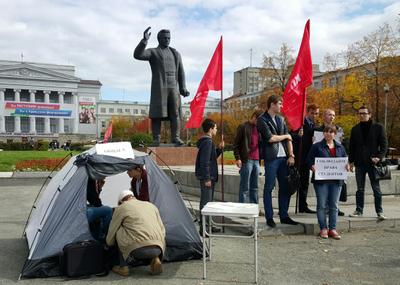 10 сентября студенты УрФУ при поддержке КПРФ провели акцию протеста у главного корпуса университета. Студенты поставили палатку с надписью "Общежитие" прямо на площади Кирова, в которую тут же и заселились. Акция привлекла широкое внимание СМИ, что, видимо, и обеспокоило руководство вуза, которое прислало рассказать журналистам, что все очень хорошо и проблем вообще нет, замглавы студенческого профсоюза УрФУ ("Союз студентов УрФУ") Артёма Плаксина, который зачем-то притащил с собой ещё и главу МГЕР Свердловской области Олега Мочалова.