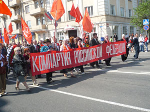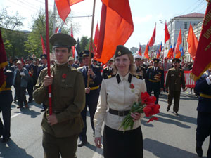 В этот день на общем фоне особенно ярко выделялась колонна КПРФ. Она празднично пестрела алыми стягами Победы, а впереди нее чеканили шаг знаменосцы КПРФ. Супруги Доровских - Сергей и Светлана, пришли на демонстрацию в форме времен Великой Отечественной войны, и это вызвало добродушный отклик со стороны многих горожан. Поэтому колонна коммунистов вызывала наибольшее одобрение, многие выражали поддержку патриотом, фотографировались со знаменосцами.
