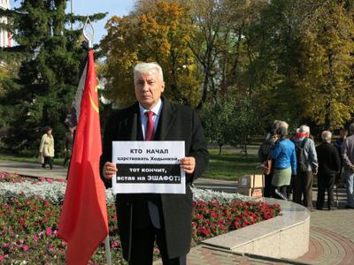 Пока шло собрание, коммунисты по одному подходили к флагу СССР с траурной лентой и брали в руки плакаты, на которых было написано: