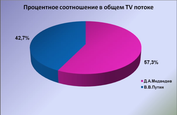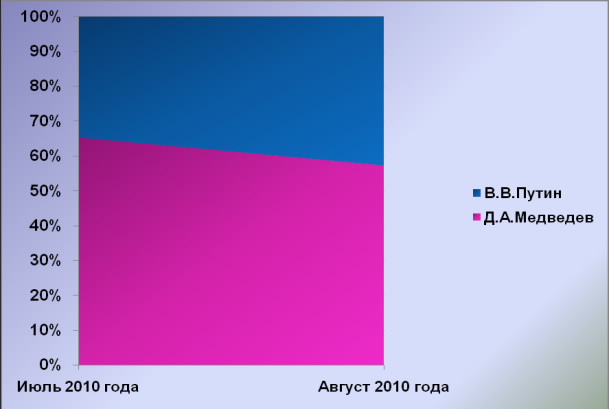 Согласно данным системы анализа и мониторинга СМИ «Медиалогия», в августе 2010 года ведущая тенденция представленности в медиа-пространстве лидеров государства, в соответствии с которой разрыв в показателях Д.А.Медведева и В.В.Путина был колоссальным, претерпела существенные изменения. Если ранее президент появлялся на экранах телевидения практически в два раза чаще премьера (июль – 65,3% против 34,7%), то август ознаменовался существенным расширением информационного телеполя, отданного председателю Правительства РФ: 42,7% в противовес медведевских 57,3%.