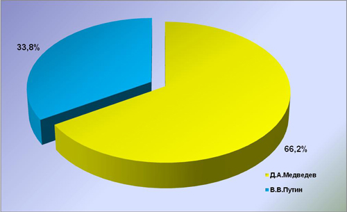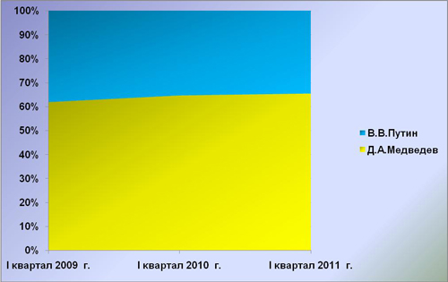 В I же квартале текущего года зафиксировано соотношение числа телесюжетов о деятельности Д.А.Медведева и В.В.Путина – 68,8 к 31,7%, что, в целом, отражает порядок работы телевизионного сообщества в указанный период. Данный результат существенно разнится с показателями января – марта 2010 года: с медведевскими 64,7% против путинских 35,3%, что в очередной раз доказывает вывод о «ставке» телевидения на президента в его информационном противостоянии с «партнёром» по «тандему».