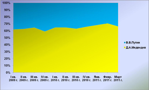 Согласно полученным данным, март 2011 года ознаменовался небольшим сокращением доли информационного поля, отданного президенту (с февральского уровня в 70,6 до 66,2 %), что, тем не менее, на 0,7% больше уровня того же периода прошлого года. Число телевизионных сюжетов, посвящённых деятельности председателя российского правительства, в марте 2011 года соответственно возросло (с 29,4 до 33,8%), но достичь прошлогодних показателей в 34,5% так и не удалось (график 1).