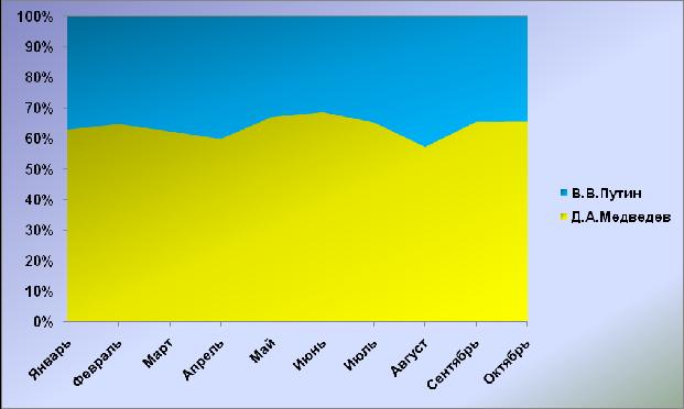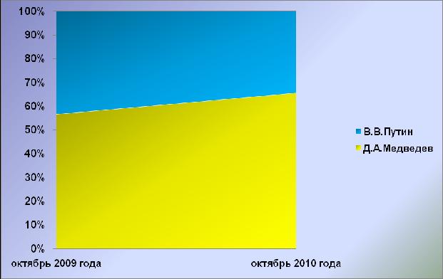 Согласно данным системы анализа и мониторинга СМИ «Медиалогия», в октябре 2010 года информационная активность представителей российского правящего тандема осталась на уровне предшествующего месяца: президентские 65,6% телевизионного пространства против премьерских 34,4% (график 1).