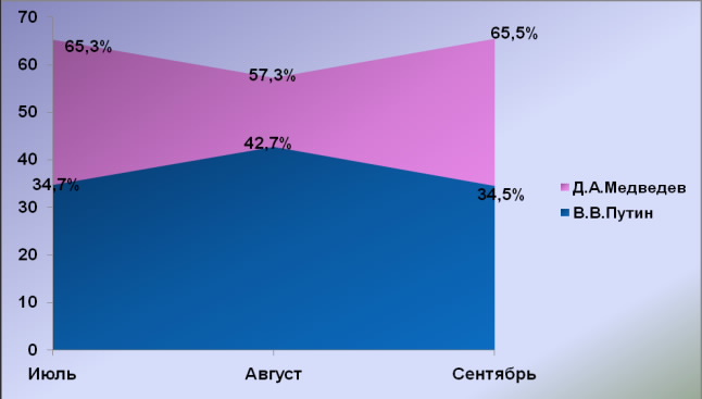 Согласно данным системы анализа и мониторинга СМИ «Медиалогия», в сентябре 2010 года разрыв в информационных показателях Д.А.Медведева и В.В.Путина вновь увеличился и после августовских «метаморфоз» вернулся к стабильному среднестатистическому уровню: президентские 65,5% против премьерских 34,5% телеэфира.