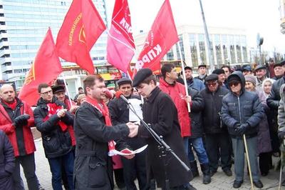 В завершение митинга, его ведущий Алексей Серов, зачитал текст резолюции, участники единогласно приняли её, а затем колонной направились на площадь Свободы, чтобы возложить цветы к памятнику В.И. Ленина – вдохновителю и организатору Великого Октября.