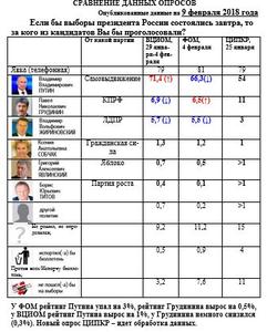 Смотрим данные ФОМ за 14 января (цифры не комментирую, у каждого центра своя методика и своя правда): рейтинг Грудинина - 6,0%. Теперь данные за 28 января - 6,3%. Наконец, за 4 февраля - рейтинг 6,5%. Рост по ФОМу с 6,0 до 6,5 - это "снижение" по версии ЭИСИ? Ну ладно заказчики ваши выводы не перепроверяют...