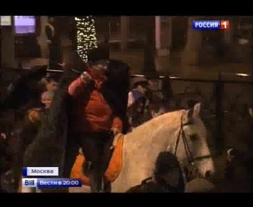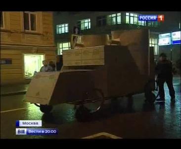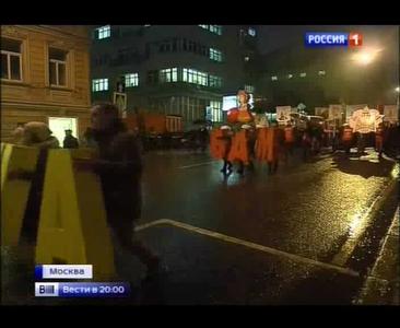 КОР: Колонна демонстрантов под "Смело, товарищи, в ногу!" и под звуки военного марша "Несокрушимая и легендарная" сворачивают с Бульварного кольца и устремляется к центру города, буквально парализуя гламурную Петровку. Одна из самых дорогих улиц России с удивлением наблюдает за шествием. Действительно, когда еще здесь можно увидеть всадника на коне и с шашкой, ракету и броневик, пусть и пластиковые?