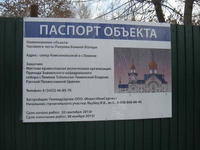 Согласно паспорту объекта в сквере «Комсомольский» 30 сентября начато строительство часовни в честь «Покрова Божией Матери». Заказчиком является Тобольско-Тюменская епархия Русской Православной Церкви.