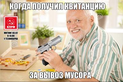 Гарольд, скрывающий боль, также засветился в интернет-агитации коммунистов. На стоковой фотографии он изображён с пистолетом в руках и надписью «Когда получил квитанцию за вывоз мусора». «Не будь, как Гарольд! Не скрывай боль! Приходи на митинг против мусорной реформы», призывают авторы мема ().