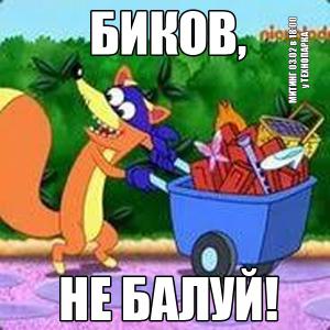 Не обошли стороной красные интернет-воины и лисёнка Жулика из мультсериала «Даша-путешественница». На кадре он катит тележку, напоминающую контейнер для сбора ТБО. «Тюменцы, нам нужна ваша помощь остановить коммунального олигарха Бикова! Давайте, все вместе скажем: «Биков, не балуй!», гласит подпись к фотографии, очевидно обыгрывая фразу «Жулик, не воруй!», также получившую популярность в фольклоре пользователей интернета ().