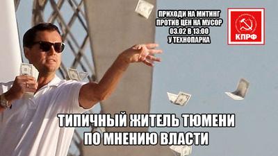 Стал персонажем интернет-агитации коммунистов и голливудский актёр Леонардо ДиКаприо. На фотографии он пускает деньги на ветер. «Типичный житель Тюмени по мнению власти», - так озаглавили её активисты КПРФ ().