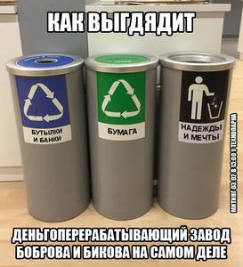 Своё видение того, как организована сортировка на «тюменском деньгоперерабатывающем заводе», коммунисты отразили ещё в одном меме. Помимо урн для бутылок, банок и бумаги, на картинке запечатлена отдельная урна, в которую выбрасываются «надежды и мечты» ().