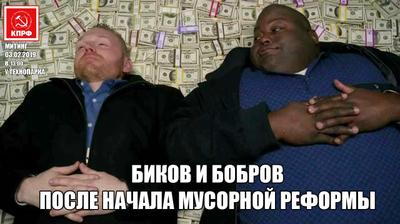 На другой картинке запечатлён кадр из американской криминальной драмы «Во все тяжкие», на котором персонажи Лавелла Кроуфорда и Боба Оденкерка лежат на пачках с долларами. Данный кадр коммунисты снабдили комментарием «Биков и Бобров после начала мусорной реформы» ().