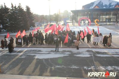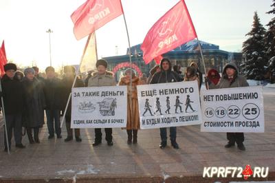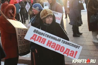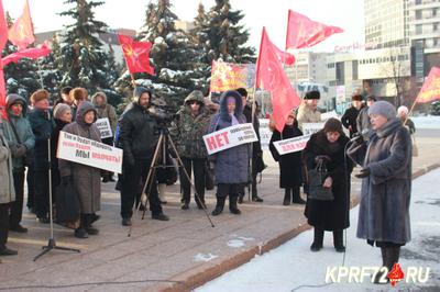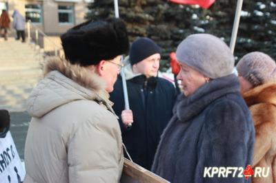 На митинге выступила первый секретарь Тюменского обкома КПРФ Тамара Николаевна Казанцева. Она обратила внимание собравшихся на то, что прожиточный минимум для пенсионеров подняли всего на 10 рублей, с 8530 до 8540 рублей, это на 0,02%, а проезд планируется поднять на 13,5%. Кроме проезда власти поднимают тарифы на ЖКХ, растут цены на топливо.